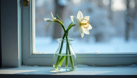 White daffodils in vase on a windowsill in winter
