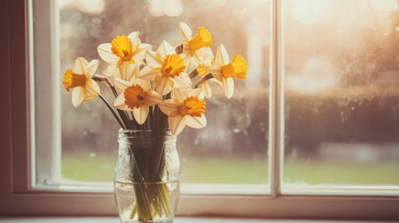 A beautiful arrangement of fresh daffodils in a glass jar on a windowsill, illuminated by soft sunset light, evoking feelings of peace and natural beauty.