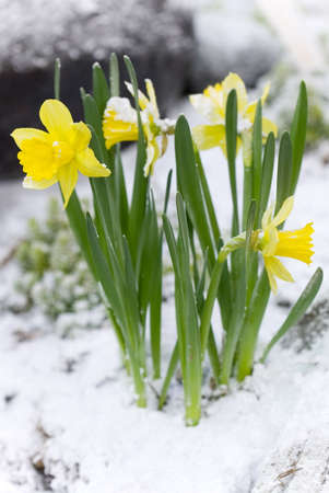 yellow blooming daffodils covered with white snow