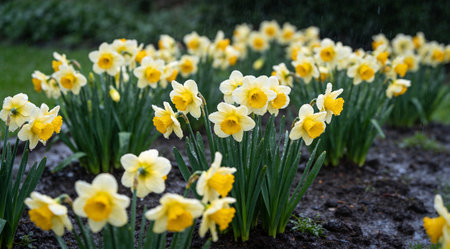 A panoramic wide view of Daffodil field growing closely together under light drizzle soft raindrops on leaves ultra realistic photography natural daylight cinematic wide composition lifelike natural scene