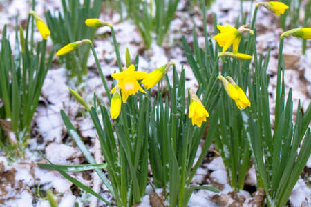 The first spring flowers are daffodils covered with snow. Beautiful daffodils in winter. Frost-resistant flowers.