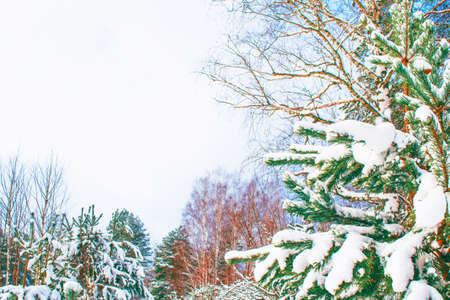 Snow covered branch of fir tree in winter forest. Scene. Pine tree after heavy snowfall, nature in winter cold season.