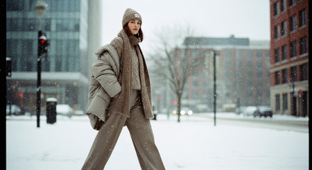 A fashionable woman in a cozy oversized sweater and scarf, standing in a snowy urban environment, exuding confidence and style