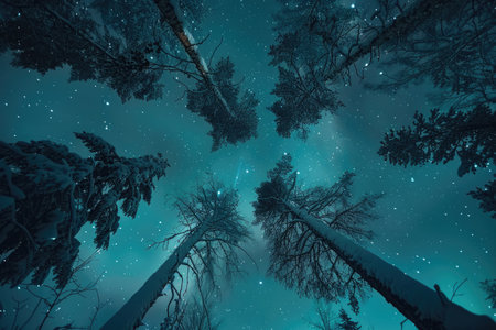 Discover a stunning winter landscape featuring tall snow-covered trees under a star-filled night sky. The tranquil beauty evokes a serene atmosphere perfect for nature lovers.