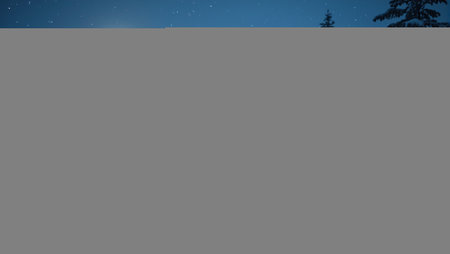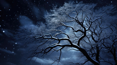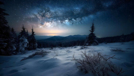 This captivating winter night landscape depicts a serene, snowy scene with glistening stars, a frosty horizon, and moonlight illuminating the tranquil surroundings. A perfect portrayal of