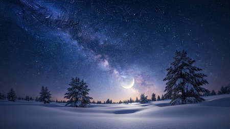 A serene winter night scene featuring a snow-covered forest under a starry sky with the Milky Way and a full moon.