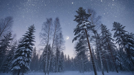 An winter forest is depicted under a vast, starry night sky. Tall pine and birch trees, heavily laden with snow, stand as dark silhouettes against the deep blue, star-filled expanse. A delicate crescent moon hangs in the sky, casting a pale, ethereal glow. The ground is covered in a blanket of pristine snow, creating a serene and tranquil atmosphere. The scene evokes a sense of quiet magic and the profound beauty of a cold, clear winter night in the wilderness.