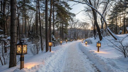 Winter road in the forest at sunset. Beautiful winter landscape with lanterns.
