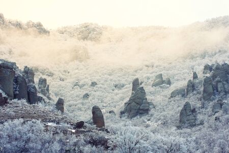 Snowy rocky mountains of the Crimea with the clouds and haze