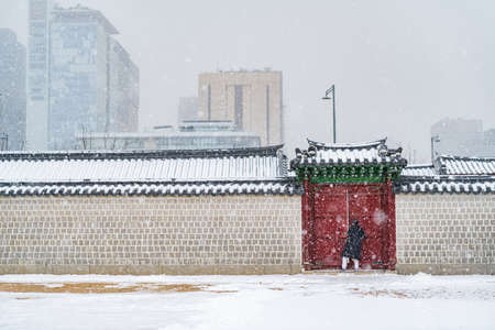 Snowy Winter Day at Gyeongbok Palace, Traditional Korean Architecture, Seoul, South Korea