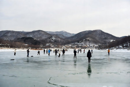 People skating on the ice of Lake Baikal, Siberia, Russia