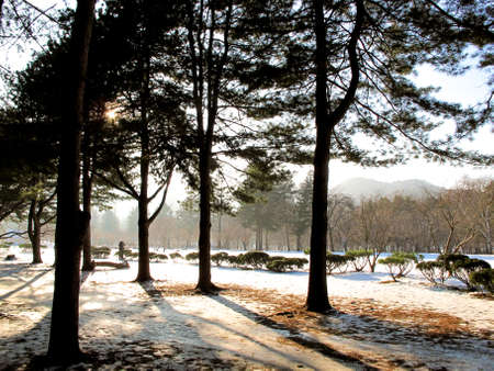 Trees in Namsan Mountain in winter with snow on the ground, with backgroud of hazy cityscape of downtown of Seoul, South Korea.