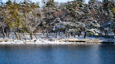 Beautiful nature,park covered by snow and freezing lake during winter at sunny day
