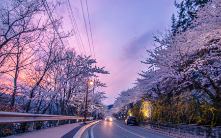 Cherry blossoms in full bloom along the road in Naju, South Korea