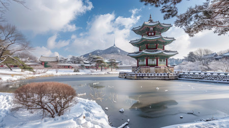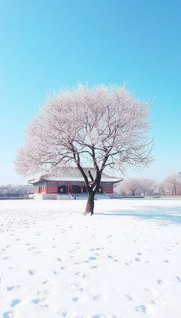 Snowy Day at a Traditional Korean Palace, Tranquil Winter Scene with a Lone Tree and Blue Sky