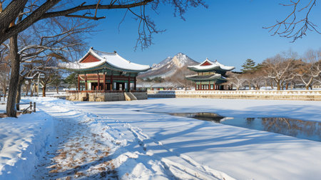 A peaceful winter day at Gyeongbokgung Palace, with snow blanketing the historic grounds.