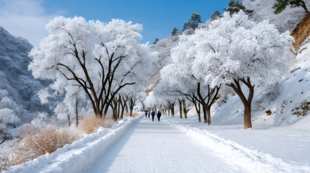 People walking along a snowy path lined with hoarfrost covered trees under a clear blue sky