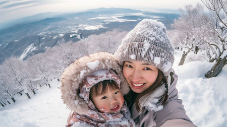 Generative AI : happy family mother and baby little daughter playing in the winter for the Christmas holidays