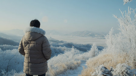 A person enjoys tranquil winter landscape while standing on a snow-covered hill at sunrise