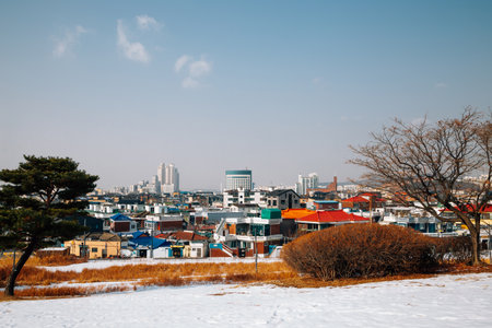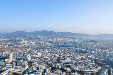 Seoul cityscapes, skyline, office buildings and skyscrapers in Seoul city, top view in winter, Seoul, Republic of Korea, in mist winter season with blue sky and cloud