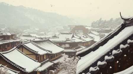 Experience a serene winter scene showcasing traditional rooftops blanketed in snow. This picturesque village captures the beauty of a tranquil, snowy day.
