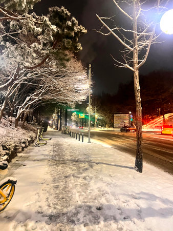 snow covering the path in between metasequoia road in haneel park, seoul, south korea