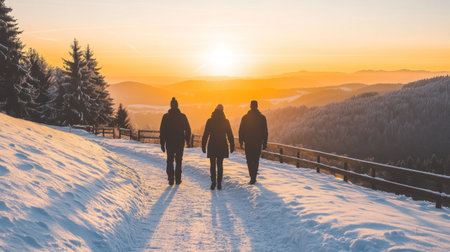 Three people walking on a snow-covered path in a winter landscape at sunset, wearing black outfits and dark jackets, with a wooden fence along the road, hills with pine trees covered in white snow, and distant mountains under an orange sky. The atmosphere is serene, with a warm, golden light reflecting off the fresh snowflakes, creating a tranquil scene. --chaos 30 --ar 16:9 --v 6.1 Job ID: aea5b165-e917-41d8-b13a-17db51d2dada