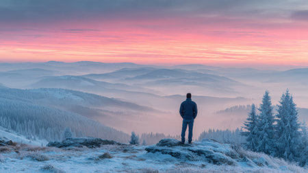 A man stands on a rocky overlook, looking out over a tranquil, snowy horizon as the sun rises, creating a peaceful atmosphere.