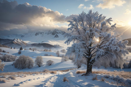 A breathtaking winter morning with the sun rising over snow-covered trees and misty valleys, illuminating the serene landscape in soft hues. The tranquility of nature enhances the picturesque view.