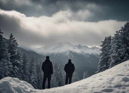 Men seen from behind looking at snow-covered mountain landscape. AI-generated.