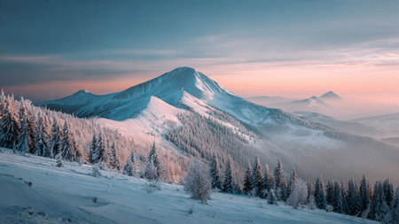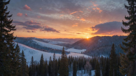 Mesmerizing winter sunset over snowy mountain landscape with pine trees.