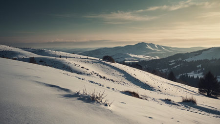 Photography captures a smooth snowy hill with soft curves under a bright winter sky, evoking a peaceful atmosphere and ideal for seasonal inspiration