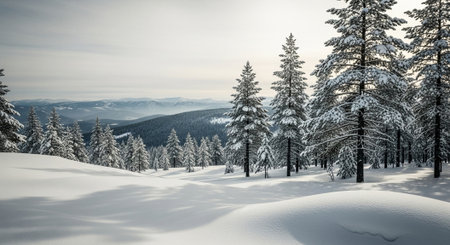 A serene winter landscape featuring snow-covered pine trees under a clear blue sky. This tranquil scene captures the beauty of nature in the cold season.