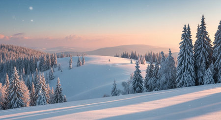 A breathtaking winter scene featuring tall evergreen trees blanketed in fresh snow beneath a soft pink and purple sky, evoking a serene and tranquil atmosphere.
