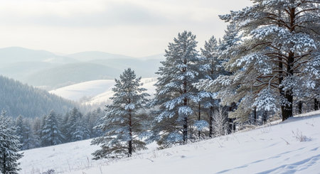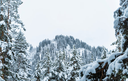 Snowy Mountain Winter Landscape Scene Beautiful Nature Cold Season Forest Trees icy pine view calm