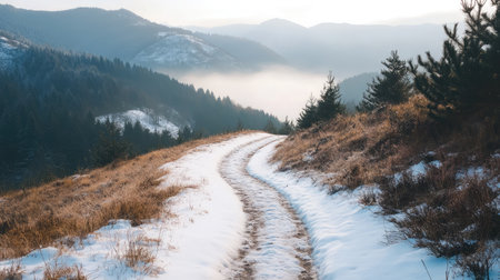 A beautiful winter landscape featuring a winding snowy pathway leading through a tranquil forest, with mountains partially veiled in mist and a serene atmosphere.