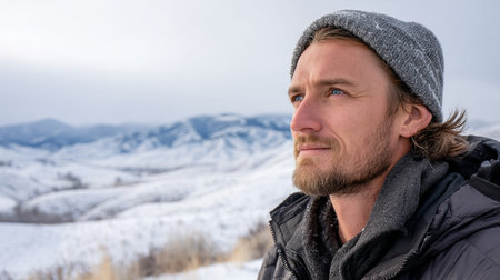 A person standing in a snowy landscape, wearing a warm coat and hat, looking at distant hills covered in snow, with soft snowfall in the air
