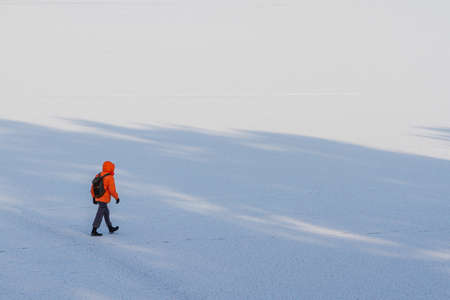 A man in an orange jacket walks in the snow on a frozen lake