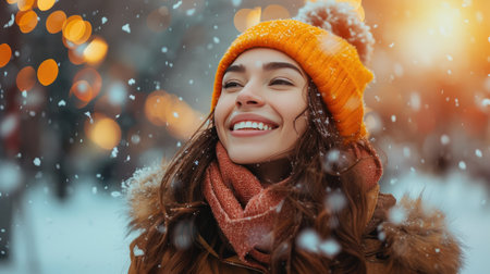 Winter Wonderland Glow Portrait of a Young Woman With Falling Snowflakes and Festive Bokeh