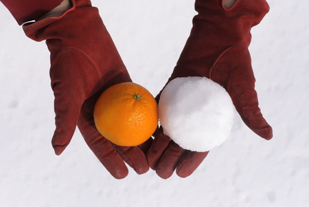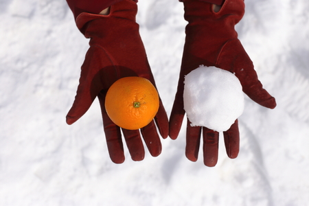 hands in colorful gloves holding mandarine. woman holding tangerine close up in snowy winter park. merry christmas. happy holidays