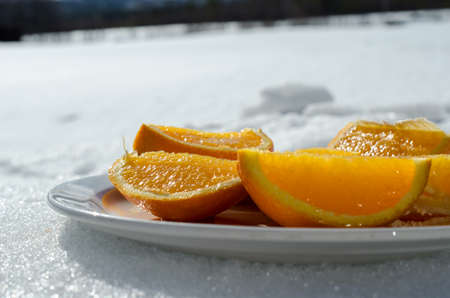 Sliced oranges on a plate on snow