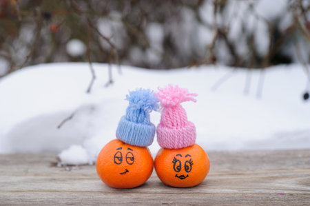 funny facial expressions on the tangerines in hats