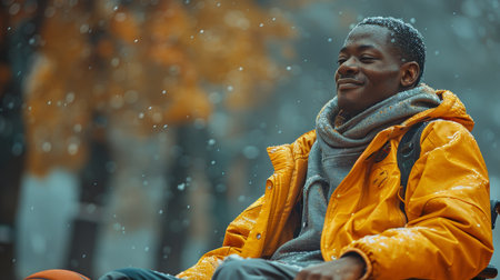 Young African man in wheelchair enjoying snowy winter day, wearing a yellow jacket and scarf, smiling