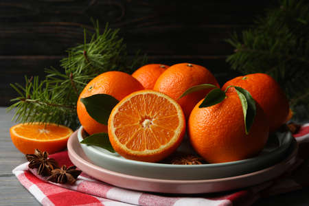Plates with mandarins, pine branches, napkin and cinnamon on wooden background