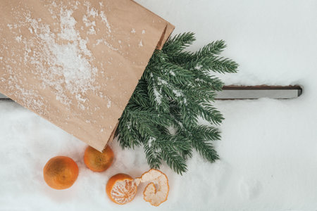 Aesthetic winter flat lay with snow, tangerines and fir branches in the craft pakage. New year background with fresh bright mandarins and spuce twig. Xmas greeting card. Minimalism. Top view.