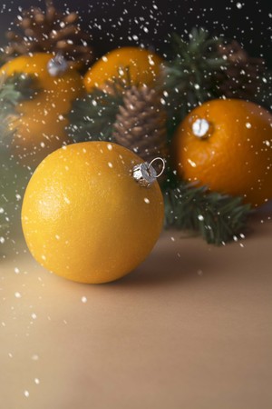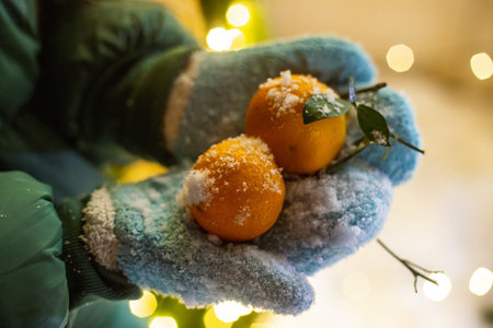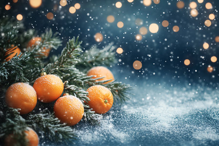 mandarins on the christmas tree, festive background with lights and snow