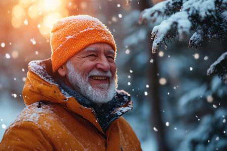 happy bearded old man enjoing snow in winter park
