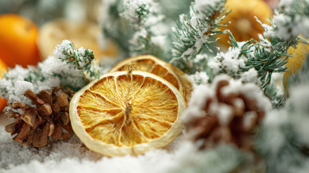 A cheerful display of dried oranges pinecones and frosted greenery captures the essence of winter celebrations and holiday warmth.