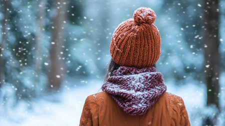 A woman in a cozy orange knit hat stands amidst gently falling snow in a serene winter forest during the afternoon