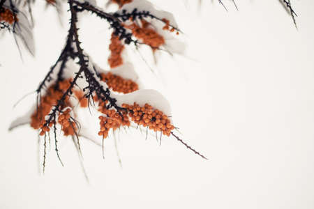 Of sea buckthorn berries on a branch under a snow hat. Winter food for birds